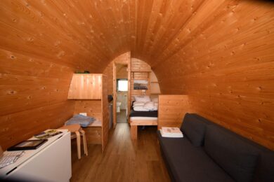 Gemak en comfort voor het hele gezin en toch dichtbij de natuur: dat vind je in de Familypods op Campland Arcen. De pod is ideaal voor gezinnen met jonge kinderen. Naast 4 vaste slaapplekken (een tweepersoons bed van 140 x 200 en een stapelbed) met 1-persoons dekbedden en kussens is de Familypod ook voorzien van een klaptafel met 4 krukjes, een toilet, een koelkastje en verwarming. Daarnaast kun je tegen geringe meerprijs een klapbed huren voor een extra gast, evenals dekbedovertrekken en handdoeken. (De prijzen zijn inclusief schoonmaakkosten en exclusief toeristenbelasting).